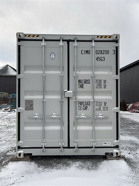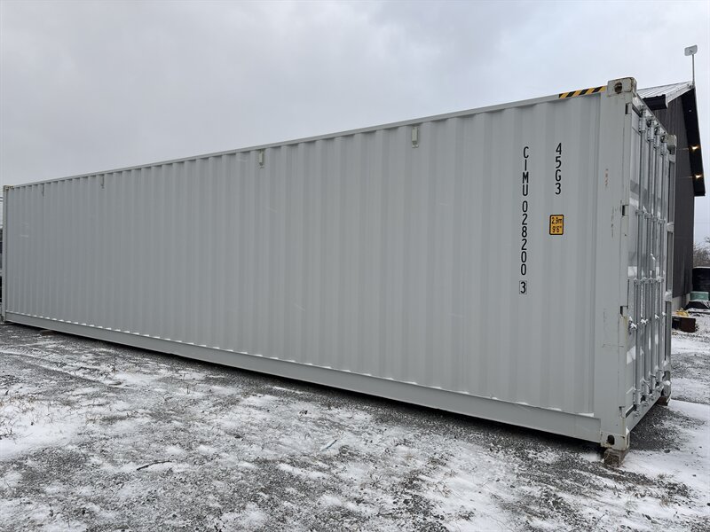 2025 Container 40HC Side Door — 40-foot high-cube cargo container with factory side access. Factory-standard features include COR-TEN weathering steel corrugated walls and roof, ISO corner castings, sturdy double rear doors with full-length cam locking bars and gasket seals, a flush-fitting hinged side personnel door with weather seal, treated marine-grade plywood flooring on steel cross-members, passive ventilation ports, and nominal high-cube height (approximately 9'6" exterior / 8'10" interior). Exterior finish is light gray; interior is the factory cargo finish (bare/primed steel walls and treated plywood floor). This unit is in excellent overall condition.